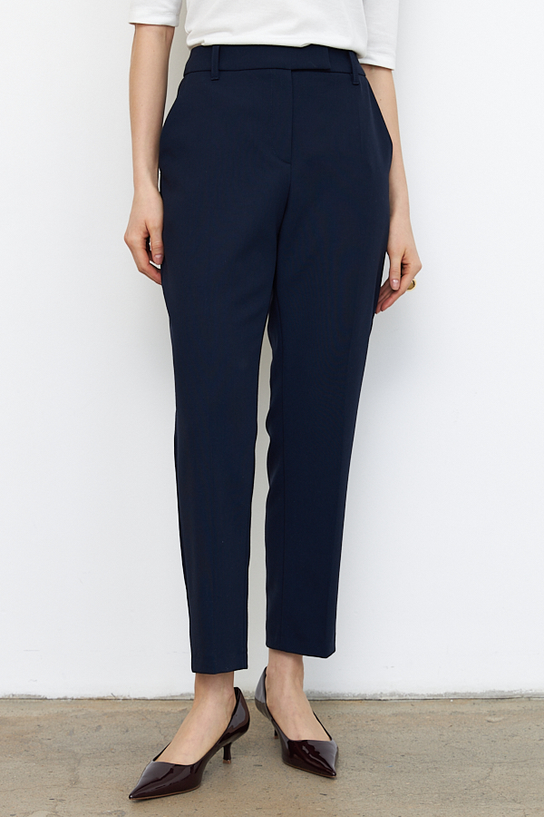Брюки прямого силуэта, зауженные книзу из костюмной ткани. Застёжка на молнию-гульфик и крючок. Карманы с подкройным бочком. Притачной пояс со шлёвками.