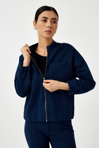 Жакет-бомбер выполнен из эластичного полотна с жаккардовым узором "клетка". Свободный силуэт с застёжкой-молнией и накладными карманами. Рукав втачной в спущенную пройму. Нижняя часть рукава и низ изделия присборены на резинку. Линия горловины оформлена воротником-стойкой.