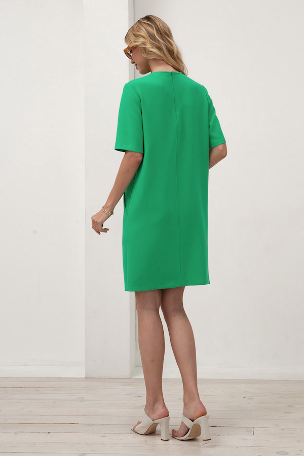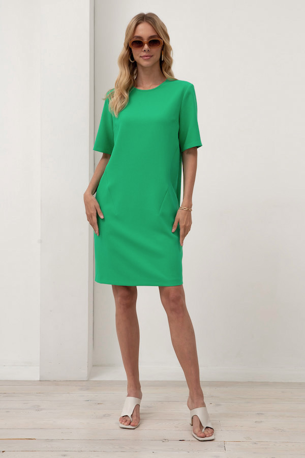 Платье свободного силуэта из плательной ткани. На передней части изделия выполнены декоративные рельефы и карманы. Втачной короткий рукав. Круглый вырез горловины, по среднему шву спинки застёжка на молнию.