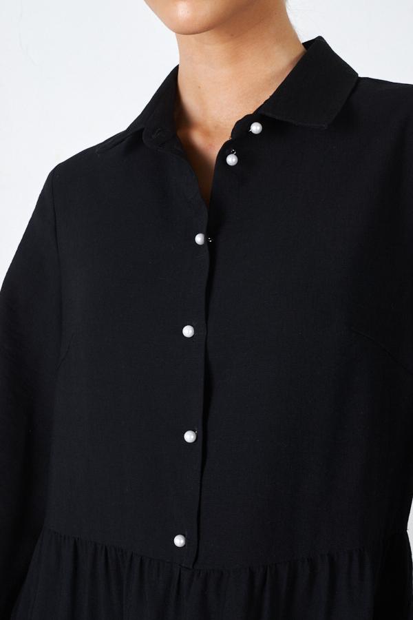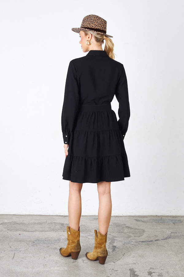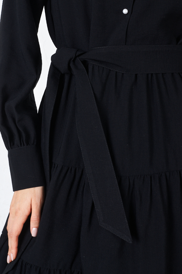 Платье свободного силуэта из вискозной ткани с крэш-эффектом. Изделие отрезное по линии талии, с ярусами на юбке. Лиф с застёжкой на пуговицы. Вырез горловины обработан отложным воротником на стойке. Втачной рукав на манжете с застёжкой на пуговицы. В комплекте пояс из основной ткани. В таблице размеров представлены параметры человека, а не изделия.
