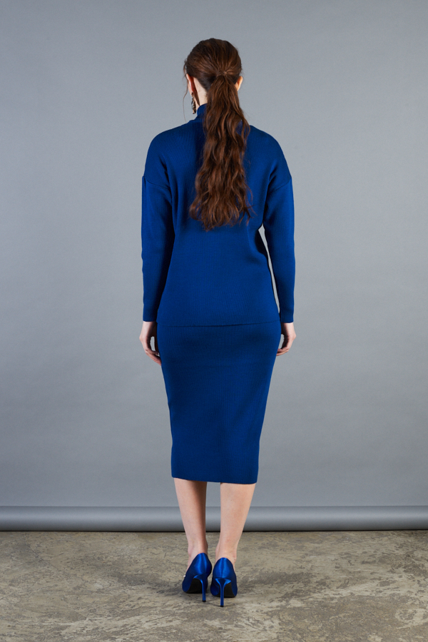 Костюм из джемпера и юбки с рисунком в узкий рубчик. Юбка прилегающего силуэта. Пояс с эластичной резиной. Джемпер свободного силуэта. Рукав втачной в спущенную пройму. Вырез горловины оформлен воротником-стойкой с отворотом. Изделие выполнено из мягкой структурированной пряжи.
