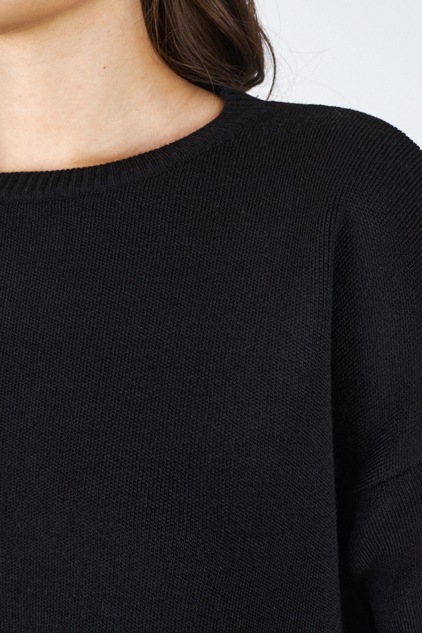 Костюм из джемпера и юбки. Джемпер свободного силуэта со спущенной линией плеча и длинным рукавом. Круглый вырез горловины, низ изделия и низ рукава оформлены резинкой. Юбка прилегающего силуэта, зауженная книзу. Пояс с эластичной резиной обеспечивает хорошую посадку по фигуре. На переднем полотнище юбки асимметричный разрез. Изделие выполнено из мягкой структурированной пряжи.