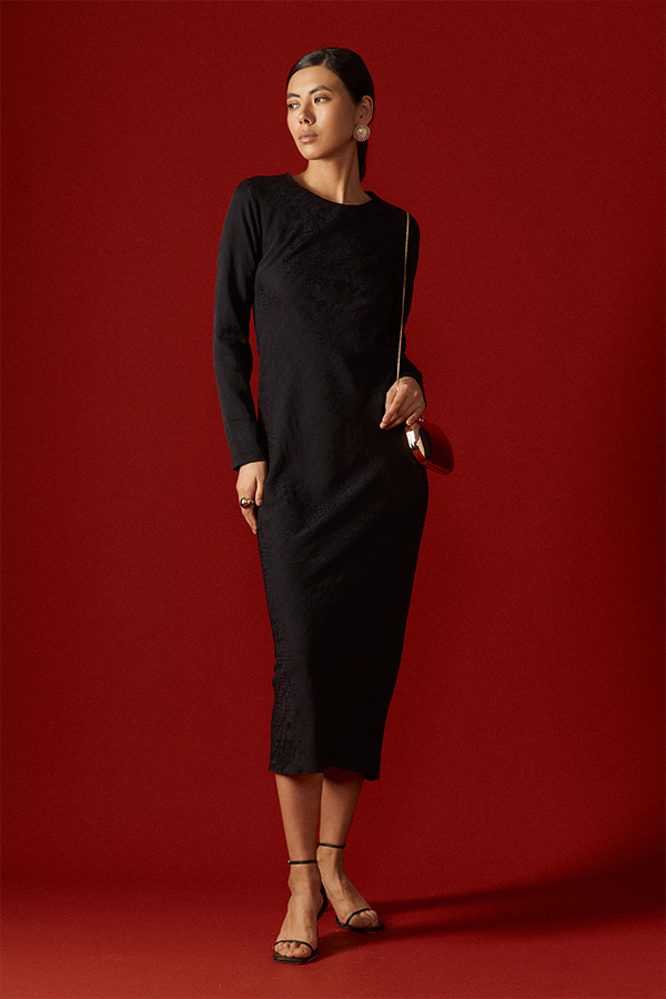 Платье прилегающего силуэта из вискозной ткани с вытканным жаккардовым узором "рептилия". Крой платья по косой. Втачной длинный рукав. Круглый вырез горловины, сзади застёжка на петлю-пуговицу.