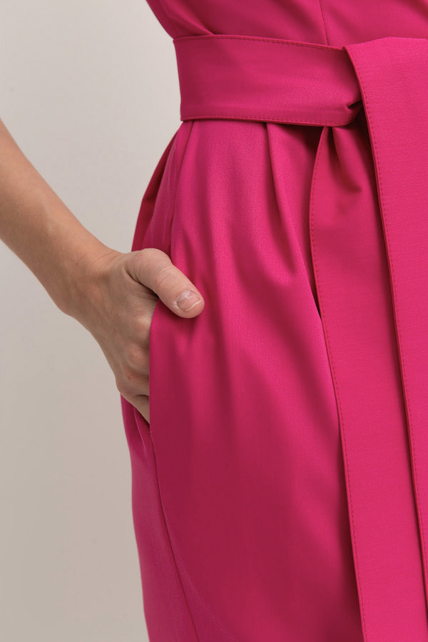 Платье приталенного силуэта из вискозной плательной ткани. Изделие отрезное по линии талии с защипами. В боковых швах карманы. Втачной короткий рукав. Притачная планка с застёжкой на пуговицы. Вырез горловины обработан отложным воротником на стойке. В комплекте пояс из основной ткани.