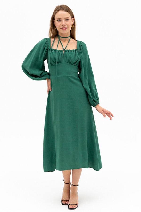 Платье приталенного силуэта, расширенное книзу из вискозной ткани с крэш-эффектом. Отрезное по линии талии. Верхняя часть с отрезным лифом, подрез фигурный. По верхнему краю лифа кулиска, в которую вставлены бретели-завязки, формирующие драпировку. Вырез горловины глубокий, расширенный, по форме напоминающий каре, с вырезом до линии подреза. Прилегание платья создано за счет рельефов на деталях переда и вытачек на деталях верхней и нижней части спинки. В верхней части среднего шва спинки застежка на потайную молнию. Рукава втачные, длинные, со сборкой по окату и низу рукава. В подгибку низа рукава вставлена резинка.