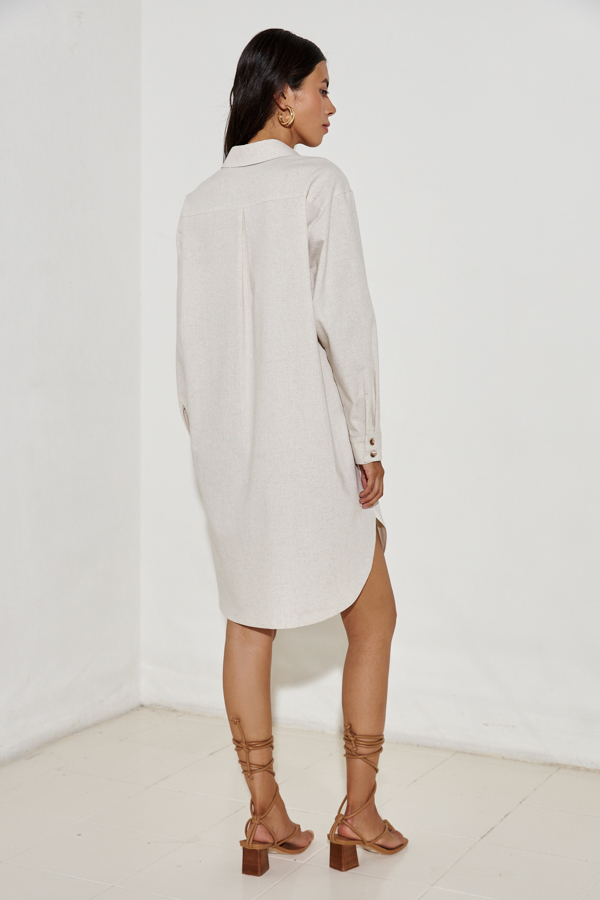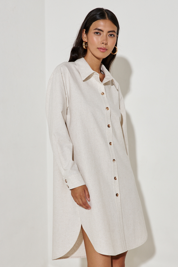 Платье-рубашка из льняной ткани. Свободный силуэт с застёжкой на планке. Низ изделия с закруглениями по бокам. Рубашечный рукав на манжете с застёжкой на пуговицы. Вырез горловины обработан отложным воротником на стойке. На задней части изделия выполнена кокетка с небольшой складкой. Достоинство этой модели в способности скрыть некоторые недостатки фигуры.