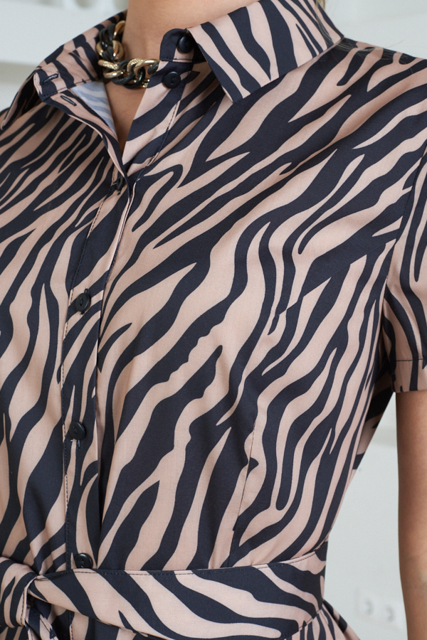 Платье приталенного силуэта из вискозной плательной ткани. Изделие отрезное по линии талии с защипами. В боковых швах карманы. Втачной короткий рукав. Притачная планка с застёжкой на пуговицы. Вырез горловины обработан отложным воротником на стойке. В комплекте пояс из основной ткани.