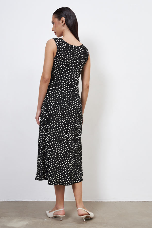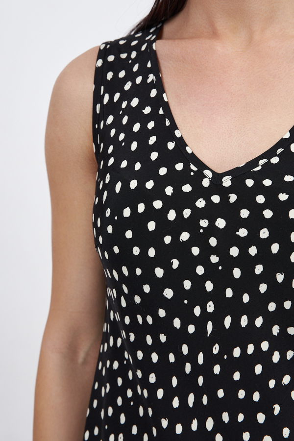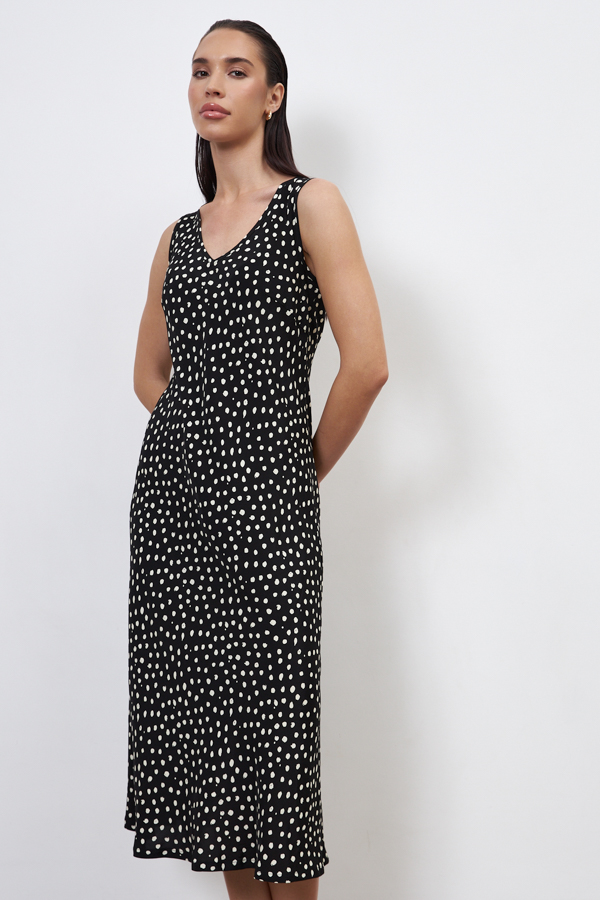 Платье прилегающего силуэта из вискозной ткани. Крой платья по косой. V-образный вырез горловины и линии проймы окантованы косыми бейками из основной ткани.