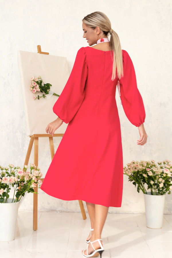 Платье приталенного силуэта, расширенное книзу из вискозной ткани с крэш-эффектом. Отрезное по линии талии. Верхняя часть с отрезным лифом, подрез фигурный. По верхнему краю лифа кулиска, в которую вставлены бретели-завязки, формирующие драпировку. Вырез горловины глубокий, расширенный, по форме напоминающий каре, с вырезом до линии подреза. Прилегание платья создано за счет рельефов на деталях переда и вытачек на деталях верхней и нижней части спинки. В верхней части среднего шва спинки застежка на потайную молнию. Рукава втачные, длинные, со сборкой по окату и низу рукава. В подгибку низа рукава вставлена резинка.