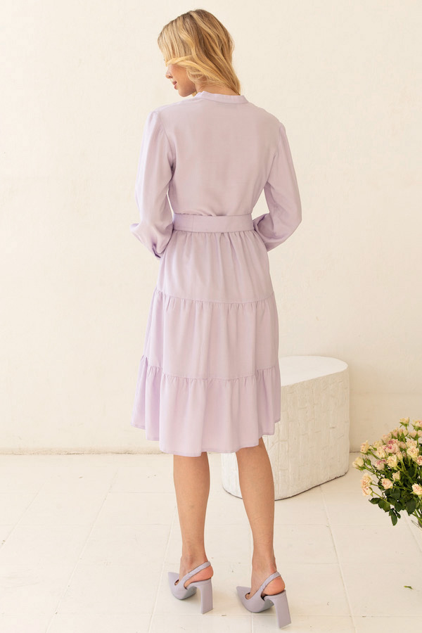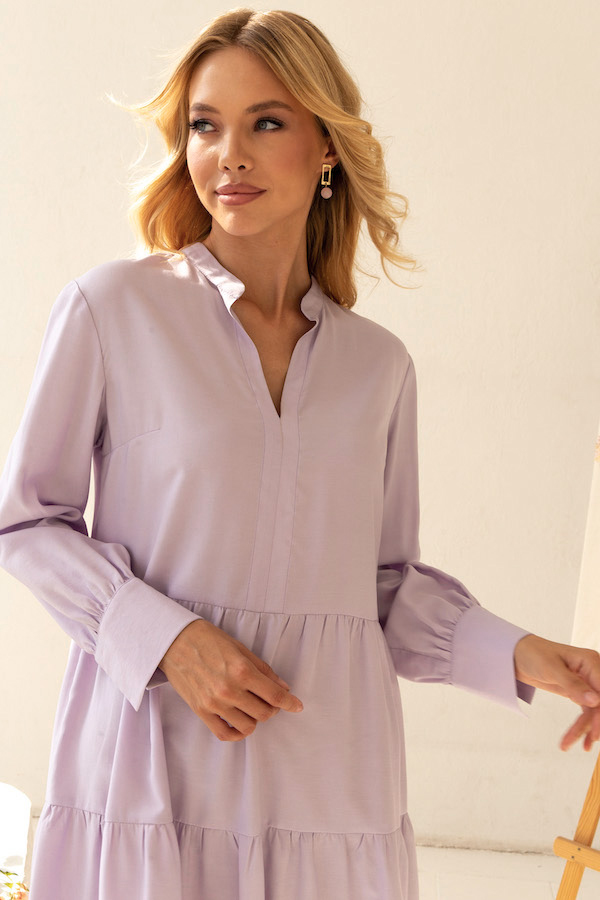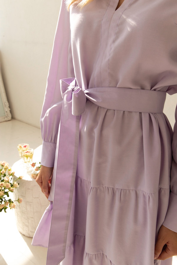Платье свободного силуэта из вискозной плательной ткани. Изделие отрезное по линии талии, с ярусами на юбке. V-образный вырез горловины обработан воротником-стойкой. Втачной рукав на манжете с застёжкой на пуговицы. В комплекте пояс из основной ткани. В таблице размеров представлены параметры человека, а не изделия.