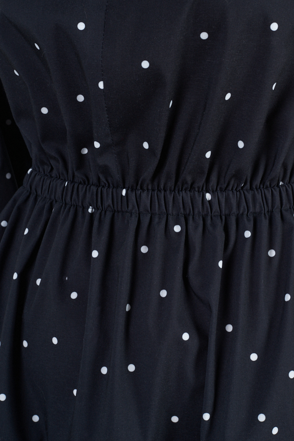 Платье свободного силуэта из вискозной ткани. Изделие по линии талии на резинке, на юбке-сборка. V-образный вырез горловины обработан отложным воротником на стойке. Втачной длинный рукав с манжетой, застегивающейся на пуговицы.
