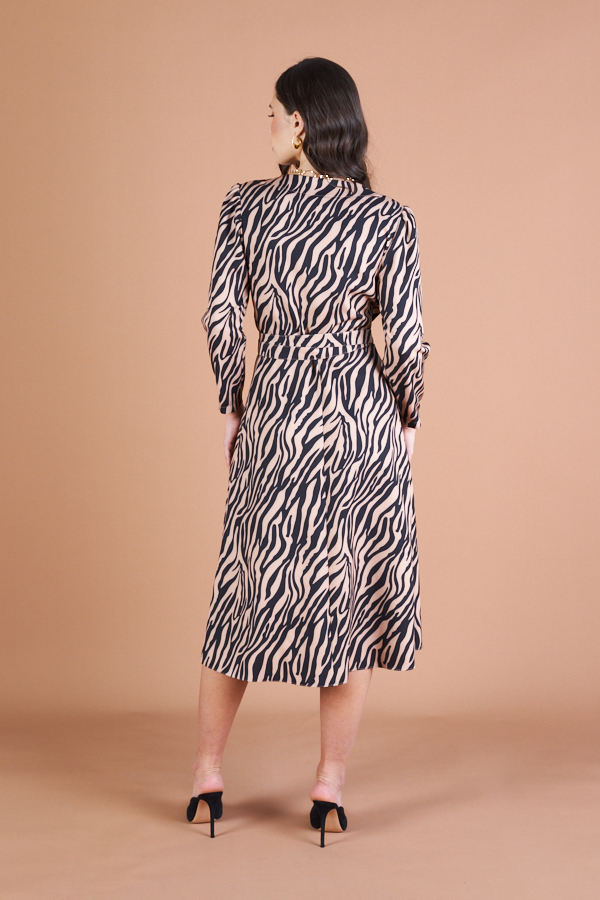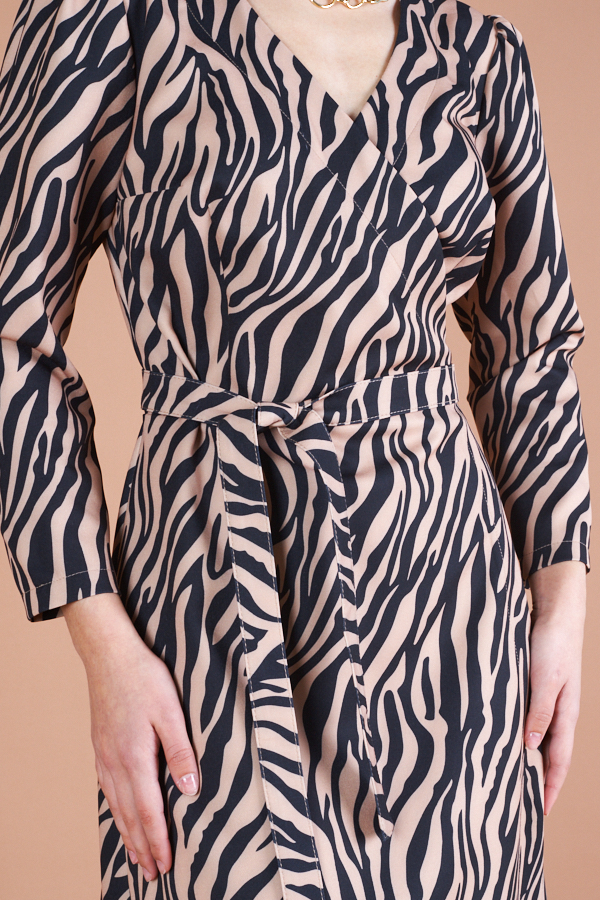 Платье с запахом фиксирующимся притачным поясом выполнено из плательной ткани. Отрезное в области талии. Лиф прилегающий. Юбка летящего силуэта. Укороченный втачной рукав со сборкой по окату.