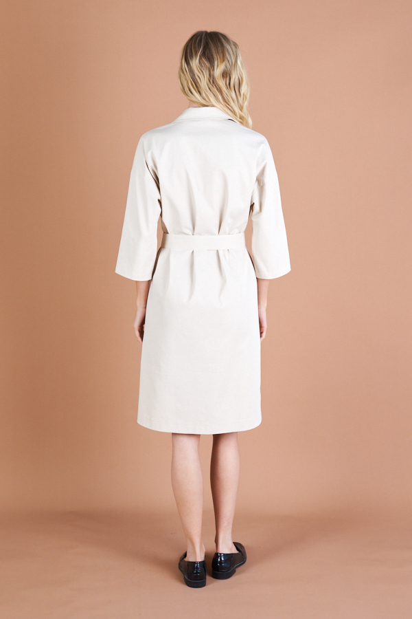 Платье свободного силуэта с застёжкой на пуговицы из хлопковой ткани. Втачной рукав в спущенную пройму. Вырез горловины обработан отложным воротником на стойке. На передней части изделия выполнена аппликация. В комплекте пояс из основной ткани.