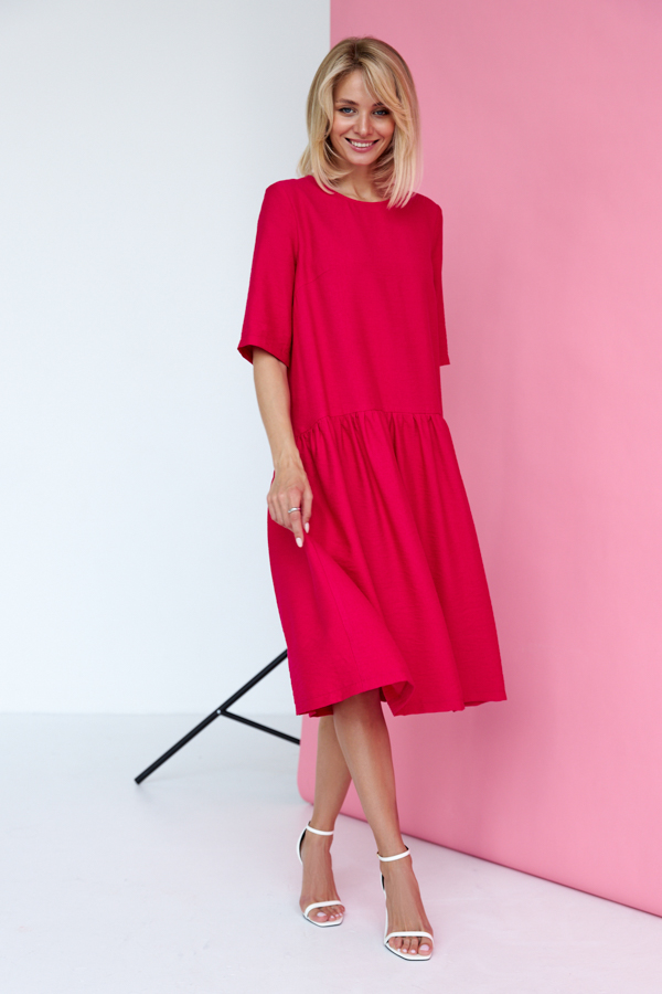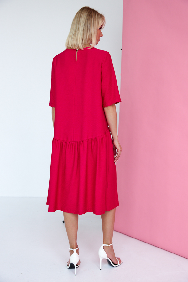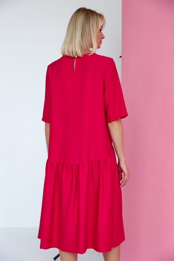 Платье свободного силуэта из вискозной ткани с крэш-эффектом. Изделие отрезное по линии бедра спереди и чуть ниже бедра на задней части. Верхняя часть юбки со сборкой. Втачной короткий рукав. Круглый вырез горловины оформлен косой бейкой из основной ткани. Сзади по среднему шву застежка-пуговица. В таблице размеров представлены параметры человека, а не изделия.