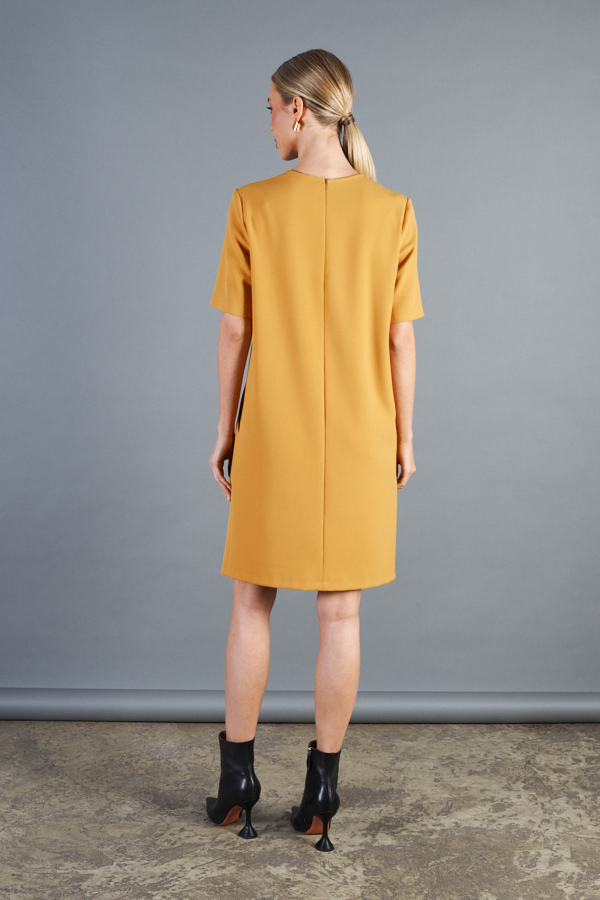 Платье свободного силуэта из плательной ткани. На передней части изделия выполнены декоративные рельефы и карманы. Втачной короткий рукав. Круглый вырез горловины, по среднему шву спинки застёжка на молнию.