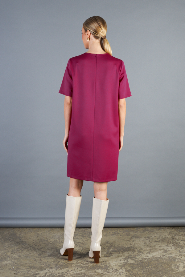 Платье свободного силуэта из плательной ткани. На передней части изделия выполнены декоративные рельефы и карманы. Втачной короткий рукав. Круглый вырез горловины, по среднему шву спинки застёжка на молнию.