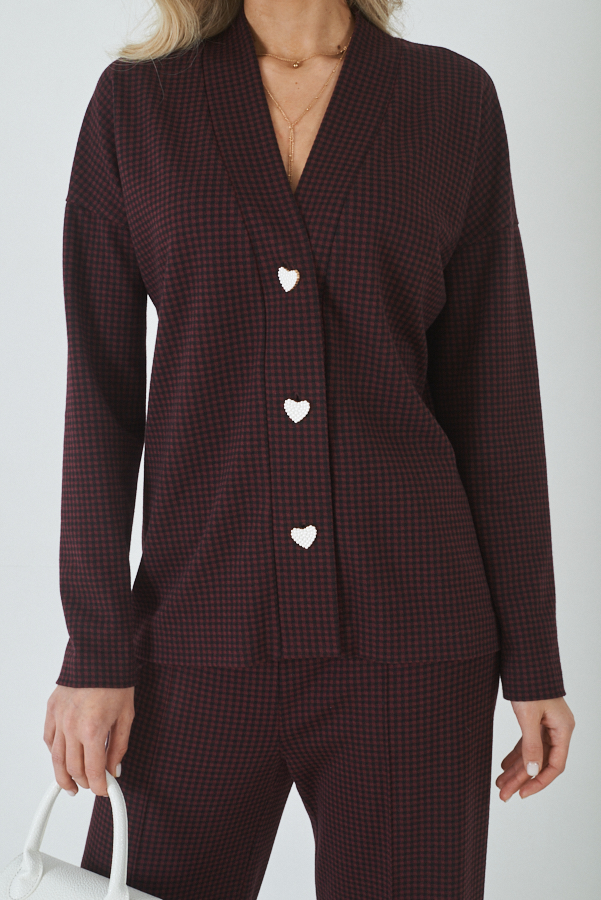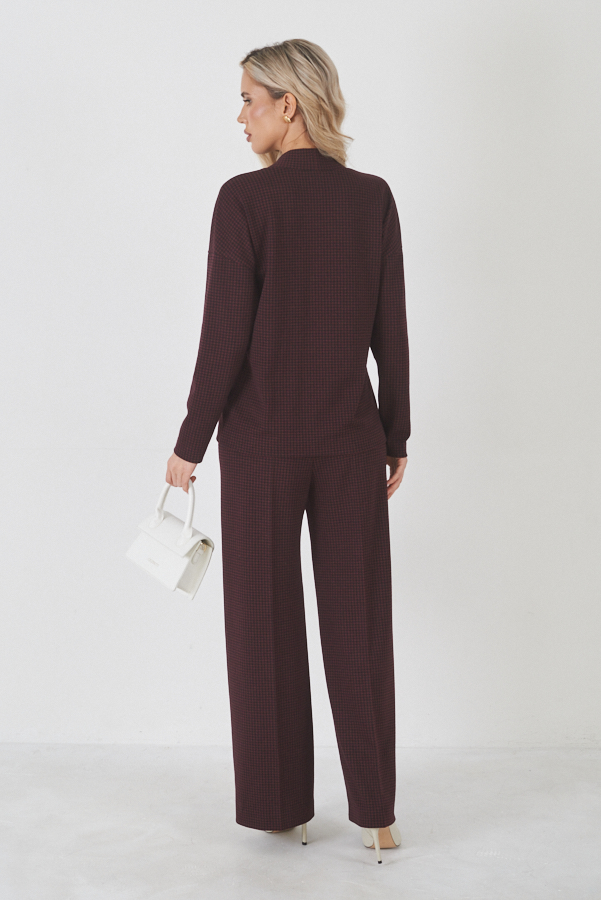 Костюм выполнен из эластичной ткани с жаккардовым узором "клетка". Брюки прямого силуэта. Пояс притачной с эластичной резиной. Кардиган свободного силуэта с притачной планкой и застёжкой на пуговицы. Втачной длинный рукав в спущенную пройму.