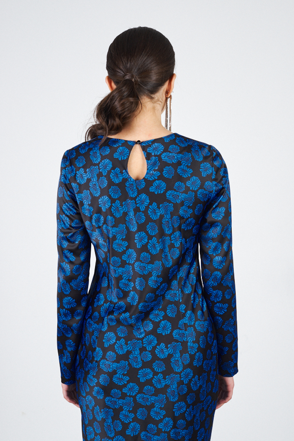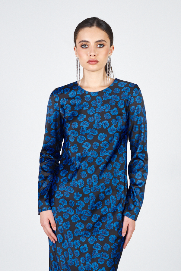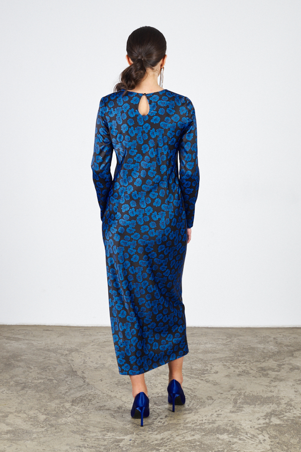 Платье прилегающего силуэта из атласной ткани. Крой платья по косой. Втачной длинный рукав. Круглый вырез горловины, сзади застёжка на петлю-пуговицу.
