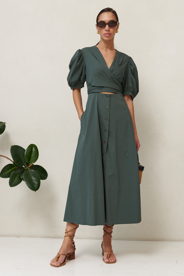 Платье отрезное по линии талии из хлопковой ткани. Изделие, прилегающее в области груди и свободное в области бедер, с карманами в боковых швах. Линия талии завышена. На полочке нагрудная вытачка переведена в широкий цельнокроеный пояс, завязывающийся сзади. На спинке талиевые вытачки. Глубокий V-образный вырез горловины. Рукав втачной, собран по окату и низу рукава в густую сборку. Низ рукава обработан манжетой. Застёжка в верхней части платья на запах, на пояс, в нижней части-на пуговицы.