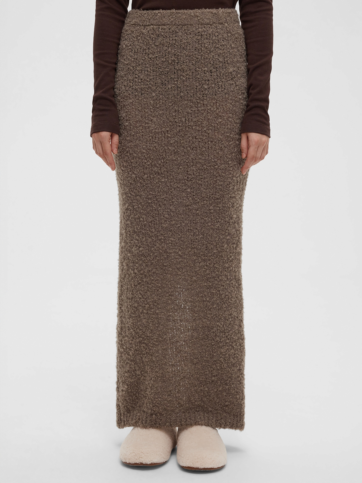 РОЗНИЧНАЯ ЦЕНА 7950руб. Юбка макси с эластичным широким поясом и шлицей по спинке. Изготовлена из фактурной смесовой пряжи с альпакой и шерстью в составе с эффектом букле.