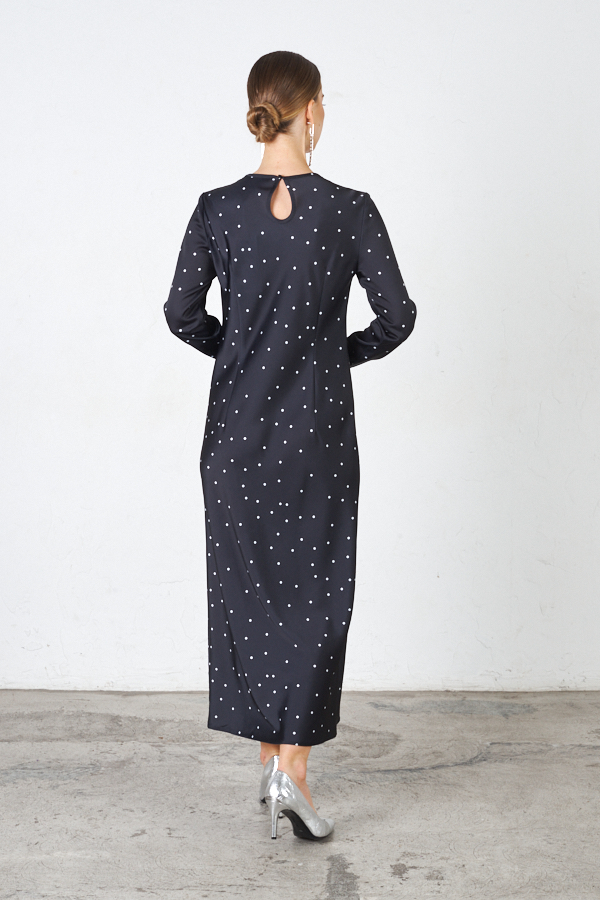 Платье прилегающего силуэта из плательной ткани. Крой платья по косой. Втачной длинный рукав. Круглый вырез горловины, сзади застёжка на петлю-пуговицу.