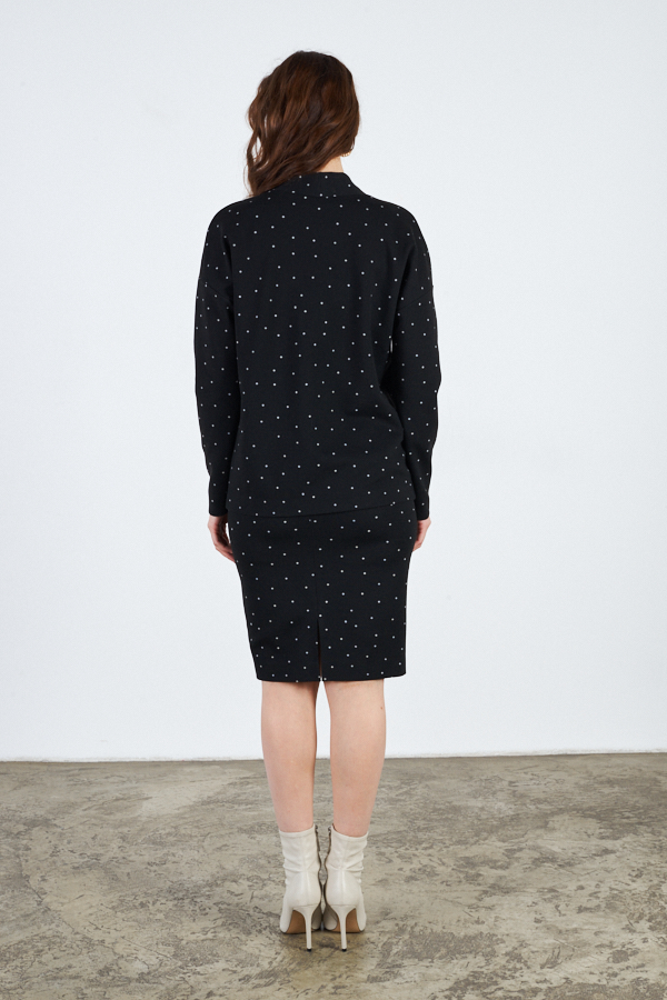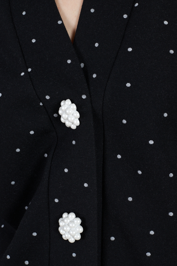 Костюм выполнен из эластичного полотна с жаккардовым узором "горох". Юбка прилегающего силуэта. Сзади по среднему шву небольшой разрез. Пояс с эластичной резиной. Кардиган свободного силуэта с притачной планкой и застёжкой на пуговицы. Втачной длинный рукав в спущенную пройму.