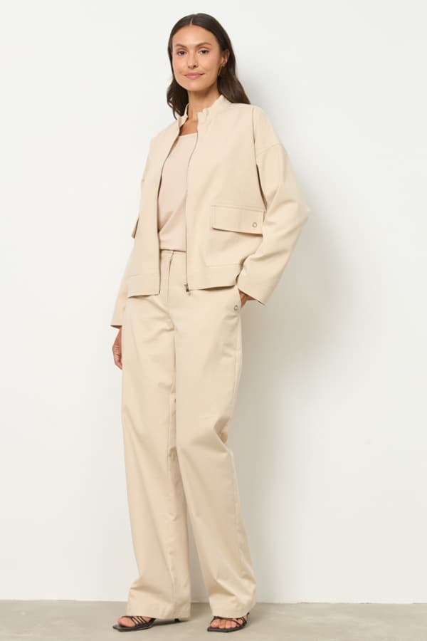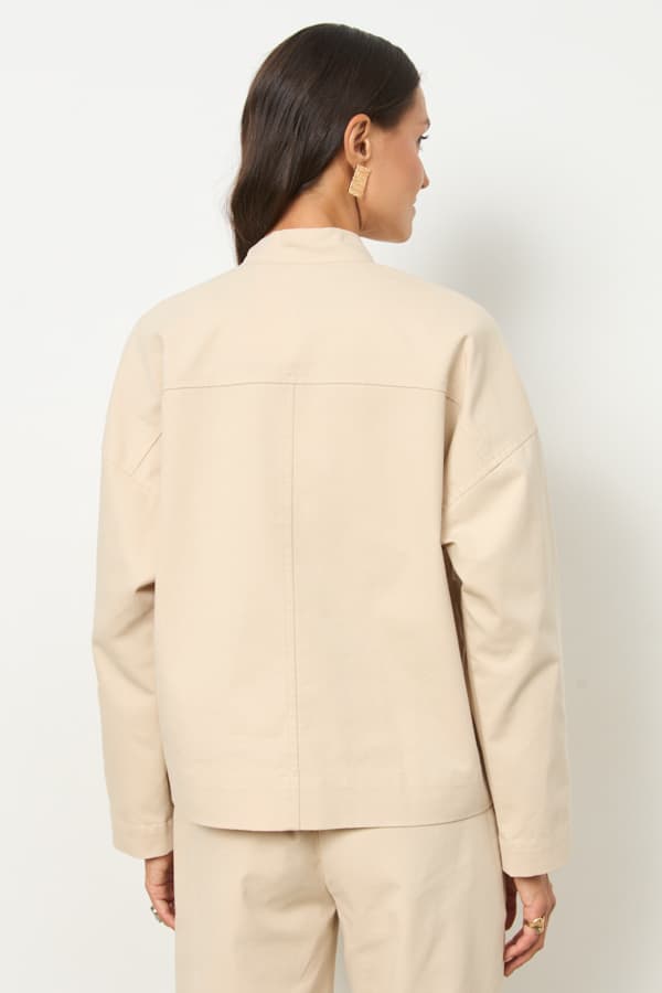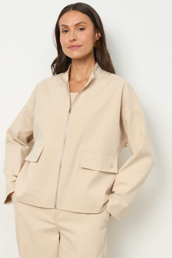 Жакет на молнии из хлопковой ткани свободного силуэта. На передней части изделия выполнены накладные карманы с клапанами. Втачной рукав в спущенную пройму. Линия горловины оформлена воротником-стойкой.