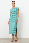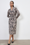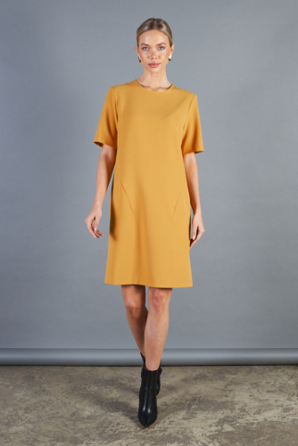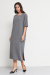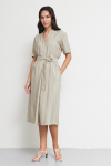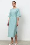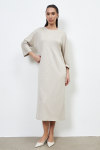 Платье свободного силуэта из плательной ткани. По центру передней части изделия выполнен шов. Цельнокроеная стойка, переходящая в V-образный вырез горловины, визуально делает фигуру стройнее. Втачной длинный рукав. Низ рукава украшен декоративным элементом, который при желании можно отстегнуть.