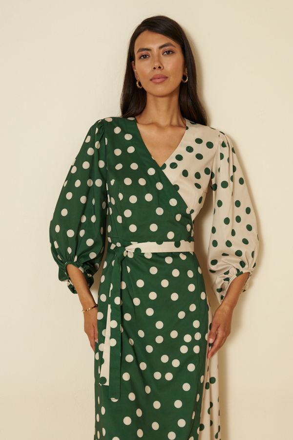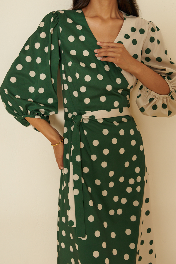 Платье отрезное по линии талии из вискозной ткани компаньонов. Изделие, прилегающее в области груди и свободное в области бедер. Глубокий V-образный вырез горловины плавно переходит в запах, фиксируется притачным поясом. Втачной рукав со сборкой по окату и низу рукава. Асимметричный низ рукава окантован бейкой.