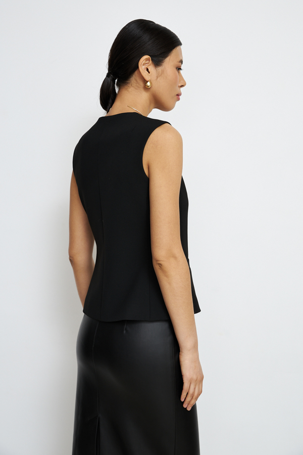 Жилет полуприлегающего силуэта с застёжкой на пуговицы из костюмной ткани. На передней части изделия нагрудные вытачки переведены в рельефы и линию кармана. Карманы прорезные, с листочкой. Спинка со средним швом, рельефами и плечевыми вытачками. Длина жилета до уровня линии бедер. Жилет на притачной подкладке.