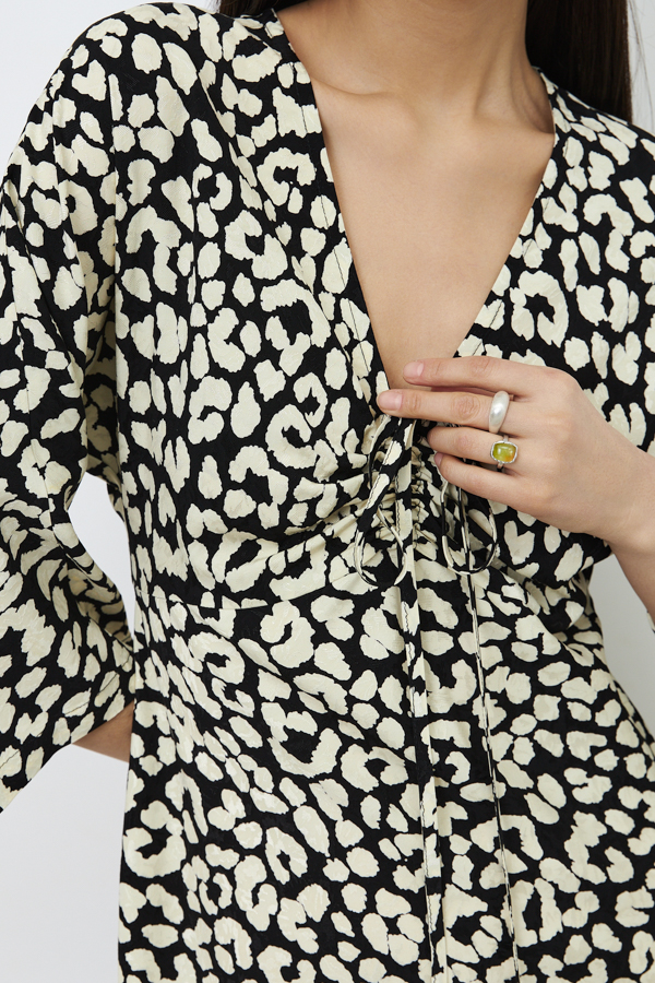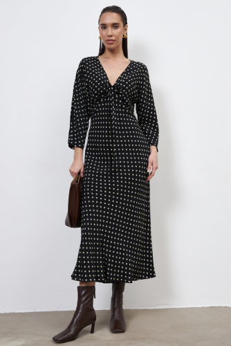 Платье полуприлегающего силуэта из вискозной ткани. Изделие отрезное по линии талии на спинке и чуть выше талии на полочке. V-образный глубокий вырез. Спереди по центру кулиска, в которую продеты два вытачных шнура-завязки. Затянутые завязки образуют драпировку. Длинный цельнокроеный рукав. Юбка скроена по косой. Застежка в левом боковом шве на потайную молнию.