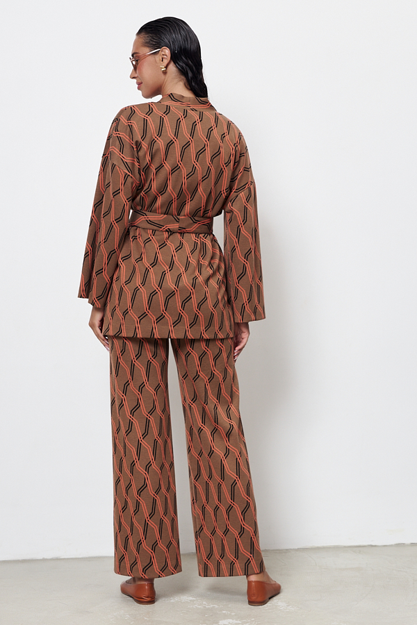 Костюм из эластичного полотна. Брюки прямого силуэта. Пояс притачной с эластичной резиной. Кардиган свободного силуэта с притачной планкой. Втачной широкий рукав в спущенную пройму. В комплекте пояс из основной ткани.