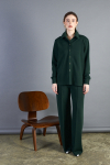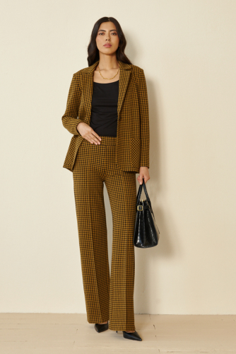 Костюм выполнен из эластичного полотна с жаккардовым узором "клетка". Брюки прямого силуэта. На передней части брюк застрочены стрелки. Пояс притачной с эластичной резиной. Жакет прямого силуэта с английским воротником и накладными карманами. На передней части жакета застежка на пуговицу. Втачной длинный рукав. Изделие с плечевыми накладками, которые при желании можно убрать.