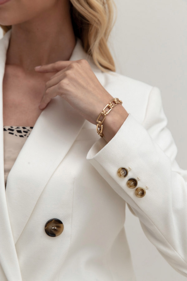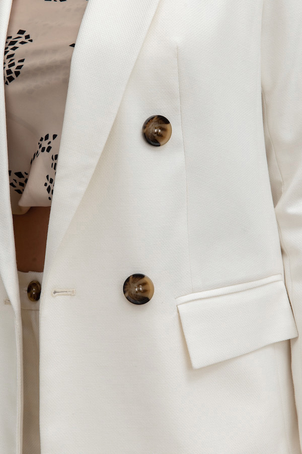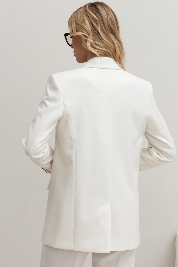 Элегантный двубортный жакет из фактурной костюмной ткани молочного цвета. Полуприлегающий силуэт с английским воротником и застежкой на пуговицы. На передней части жакета выполнен нагрудный карман с листочкой и карманы в рамку с клапаном. По центру задней части выполнена шлица - элемент декоративный и необходимый. Обеспечивает свободу движения, добавляет шику и элегантности. Втачной длинный рукав, снизу имитация шлицы с контрастными пуговицами. Изделие идеально держит форму, имеет четкую линию плеча благодаря плечевым накладкам. Жакет на подкладке молочного цвета.