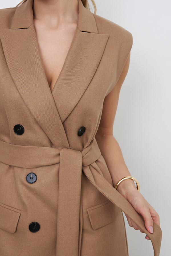 Двубортный жилет из костюмной ткани. Изделие полуприлегающего силуэта с английским воротником и застежкой на пуговицы. На передней части жилета выполнены карманы в рамку с клапаном. Изделие идеально держит форму, имеет четкую линию плеча благодаря плечевым накладкам. Жилет на подкладке. В комплекте пояс из основной ткани.