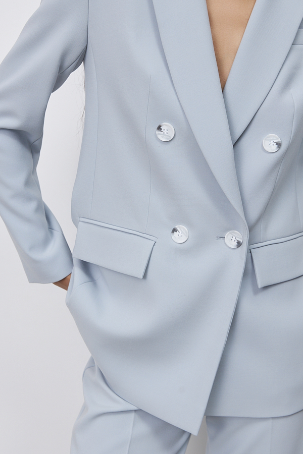 Двубортный жакет из костюмной ткани. Изделие полуприлегающего силуэта с английским воротником и застежкой на пуговицы. На передней части жакета выполнен нагрудный карман с листочкой и карманы в рамку с клапаном. По центру задней части выполнена шлица - элемент декоративный и необходимый. Обеспечивает свободу движения, добавляет шику и элегантности. Втачной длинный рукав, снизу имитация шлицы с пуговицами. Изделие идеально держит форму, имеет четкую линию плеча благодаря плечевым накладкам. Жакет на подкладке.