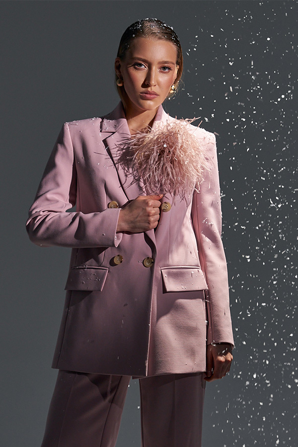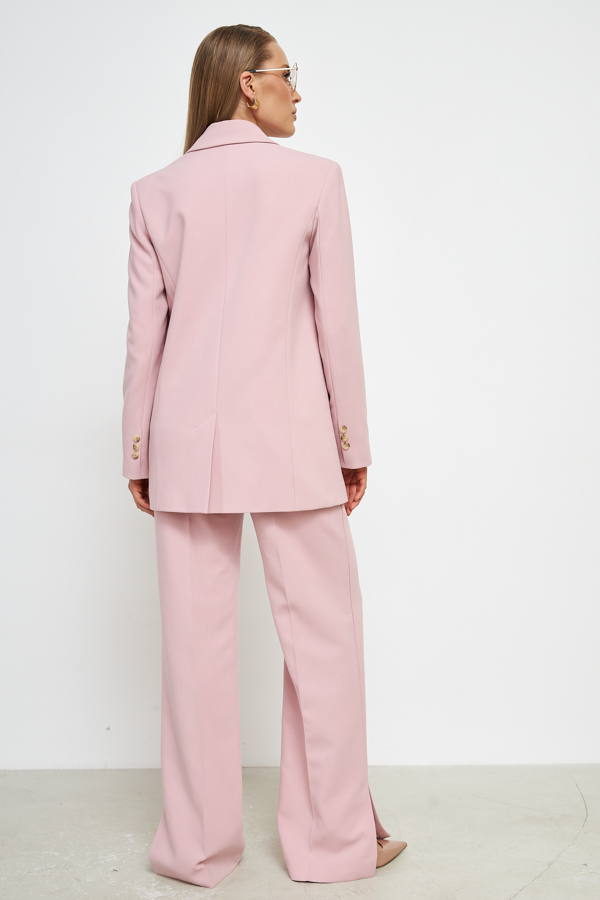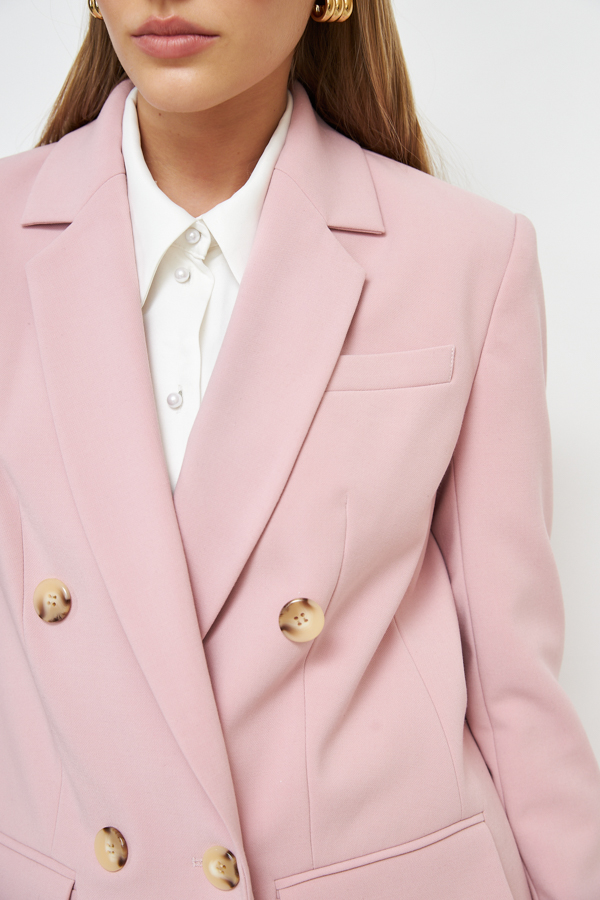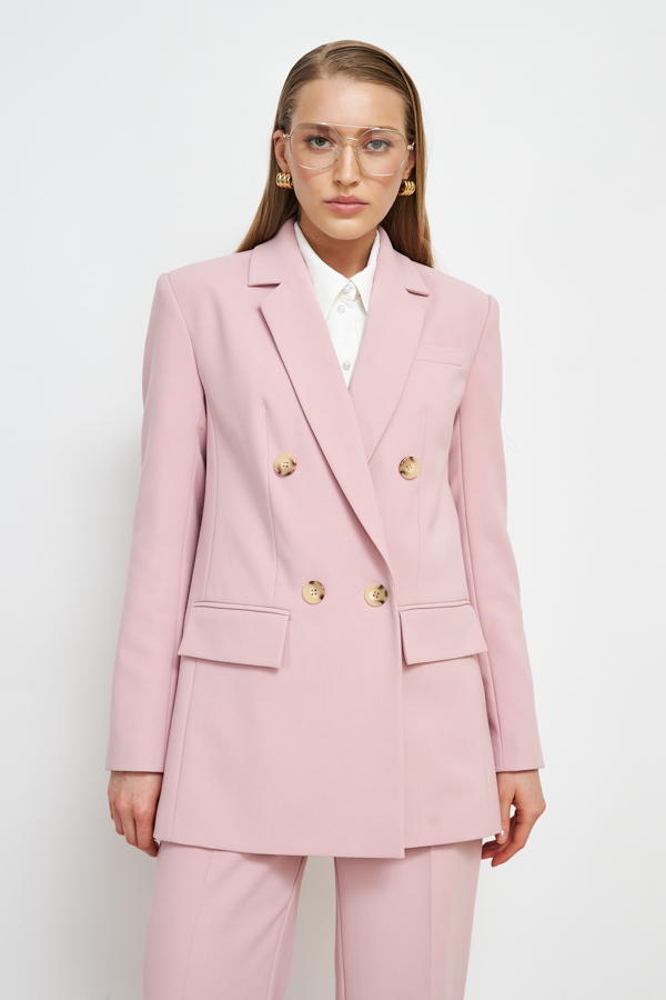 Двубортный жакет из костюмной ткани. Изделие полуприлегающего силуэта с английским воротником и застежкой на пуговицы. На передней части жакета выполнен нагрудный карман с листочкой и карманы в рамку с клапаном. По центру задней части выполнена шлица - элемент декоративный и необходимый. Обеспечивает свободу движения, добавляет шику и элегантности. Втачной длинный рукав, снизу имитация шлицы с пуговицами. Изделие идеально держит форму, имеет четкую линию плеча благодаря плечевым накладкам. Жакет на подкладке.