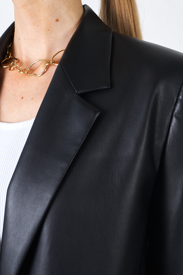 Жакет из эластичного полотна, с покрытием, имитирующим кожу. Изделие полуприлегающего силуэта с английским воротником и застежкой на пуговицы. На передней части жакета выполнены карманы в рамку с клапаном. По центру задней части выполнена шлица - элемент декоративный и необходимый. Обеспечивает свободу движения, добавляет шику и элегантности. Втачной длинный рукав, снизу имитация шлицы с пуговицами. Изделие идеально держит форму, имеет четкую линию плеча благодаря плечевым накладкам. Жакет на подкладке.