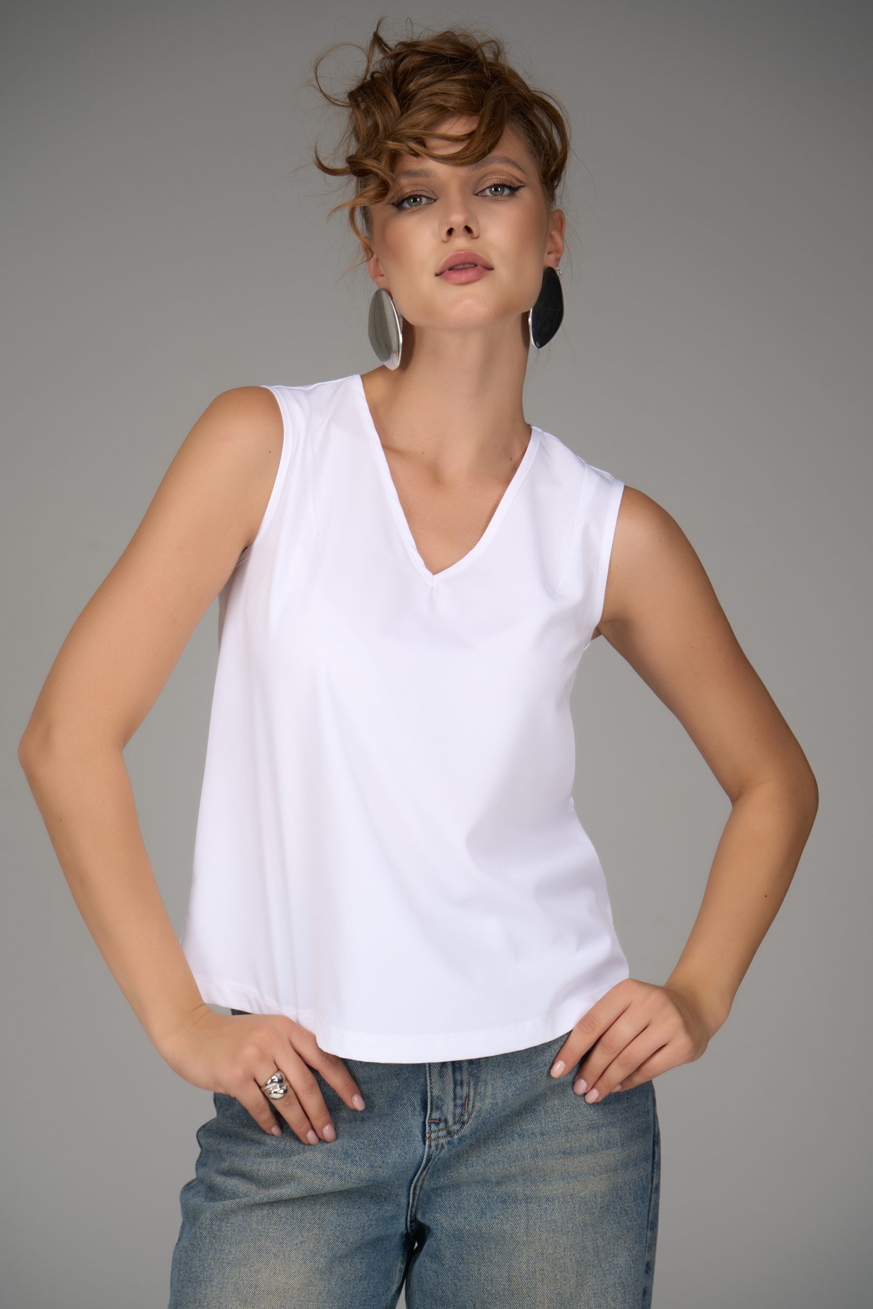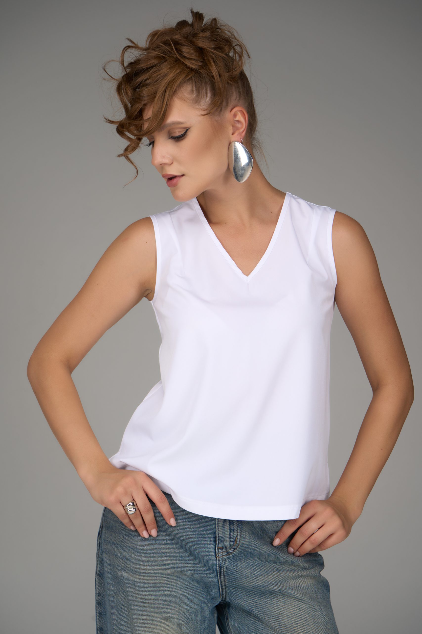 Базовый топ с V-образным вырезом, классического фасона, без рукавов. Можно носить, как навыпуск, так и заправлять. Базовым топом Вы всегда сможете дополнить любой образ в зависимости от ситуации