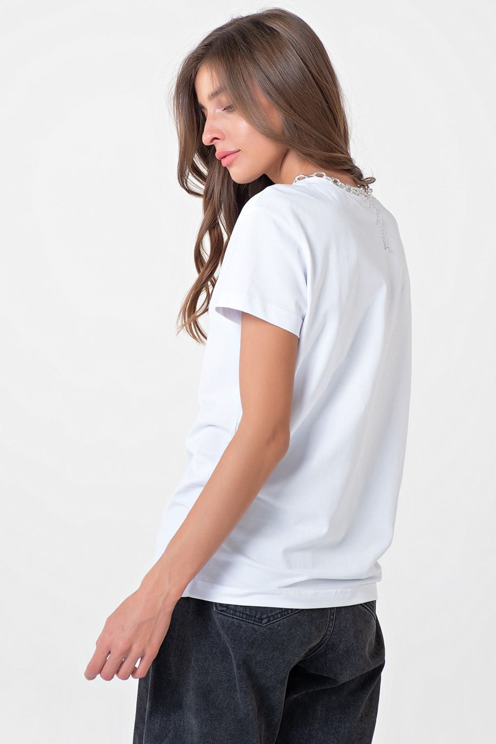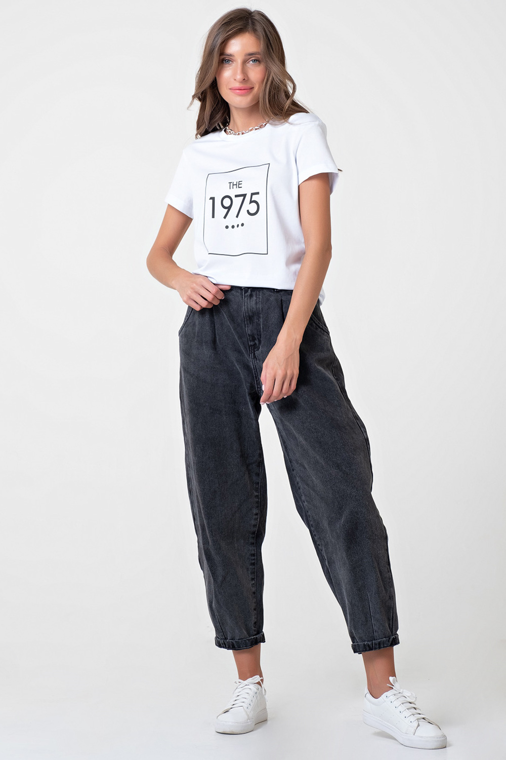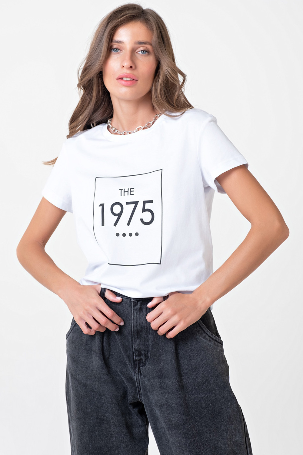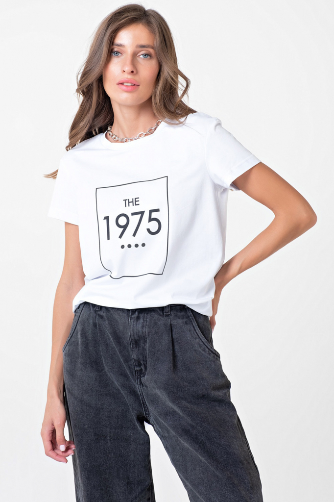 Футболка прямого силуэта из трикотажа. Детали: горловина обработана бейкой, низ рукава обработан в подгибку с отстрочкой. По переду нанесен принт.
