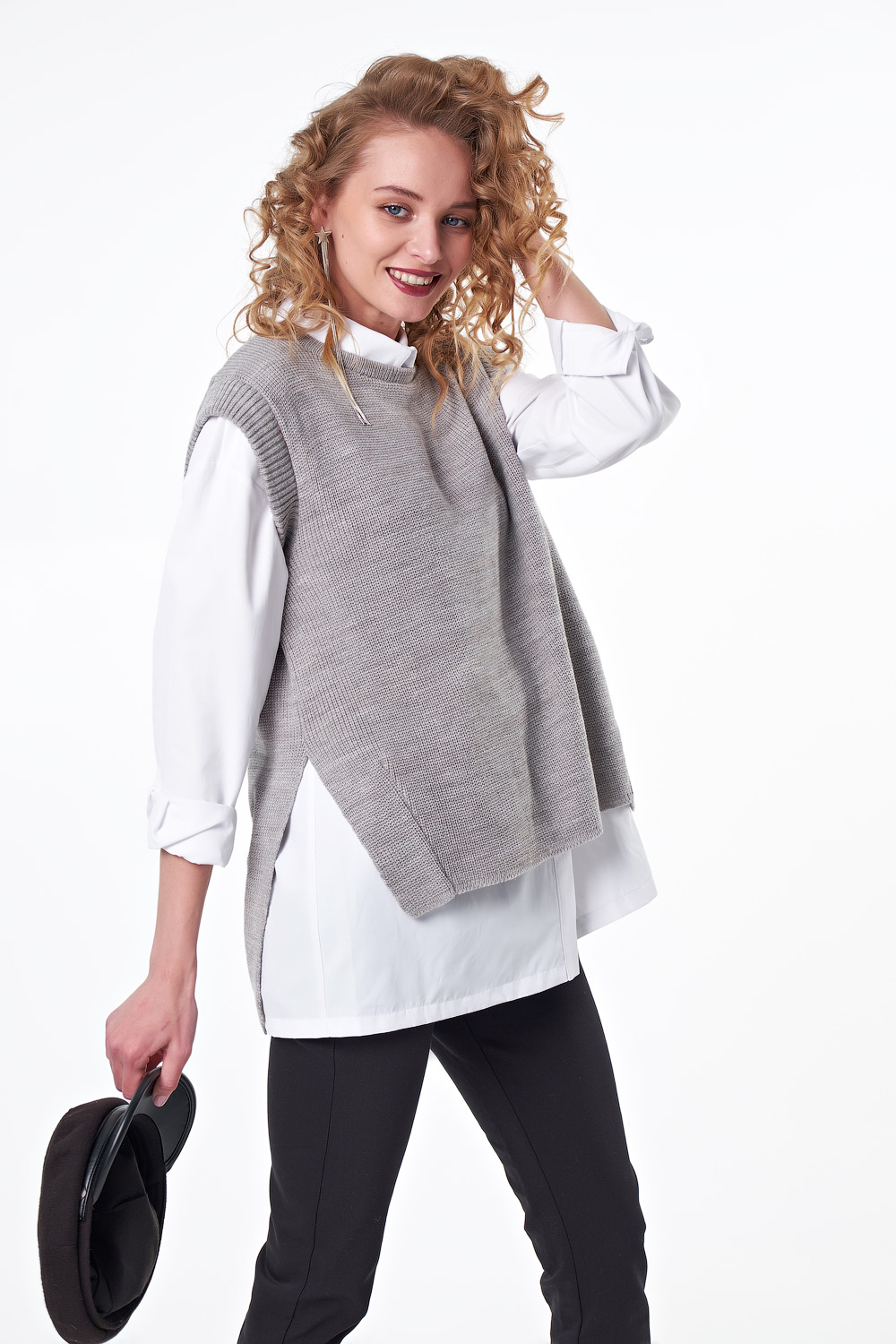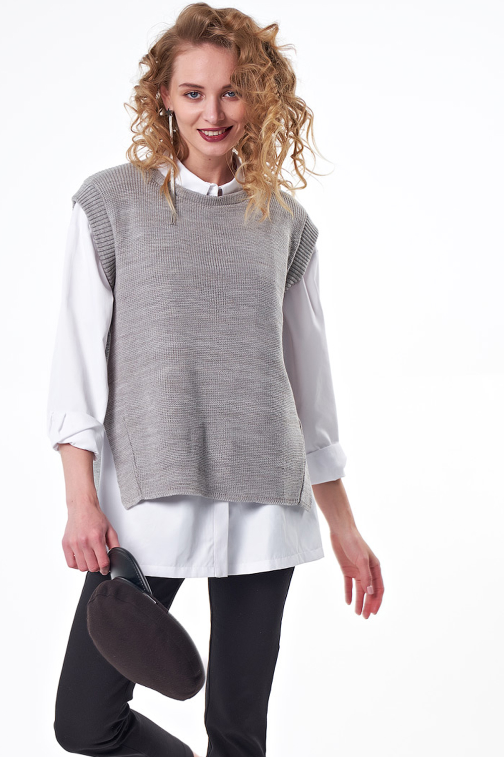 ст. цена1760руб.! Жилет вязаный оверсайз асимметричный с разрезами по бокам светло-серый меланж