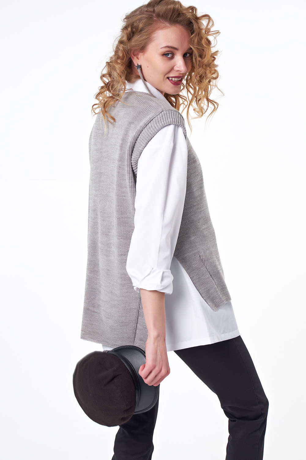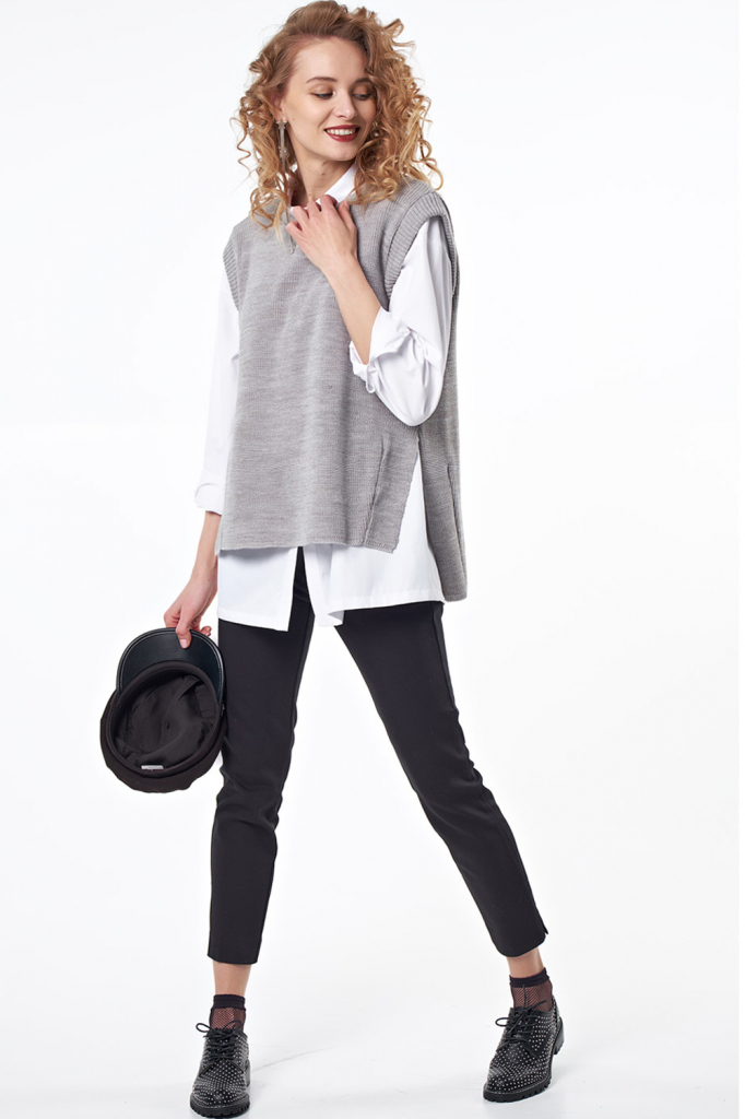 Особенности: Вязаный жилет свободного силуэта из фактурной вязки с разрезами по бокам и ассиметричным низом.