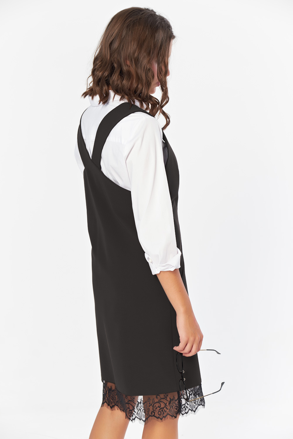 • Особенности: Сарафан прямого силуэта из костюмной ткани. Детали:глубокий  V-образный вырез горловины, широкие бретели, кружевная отделка по низу изделия. Без застежки.