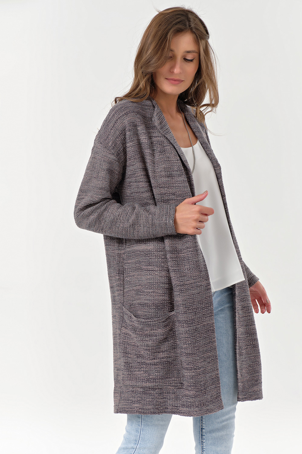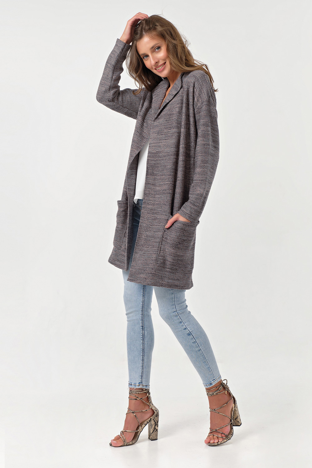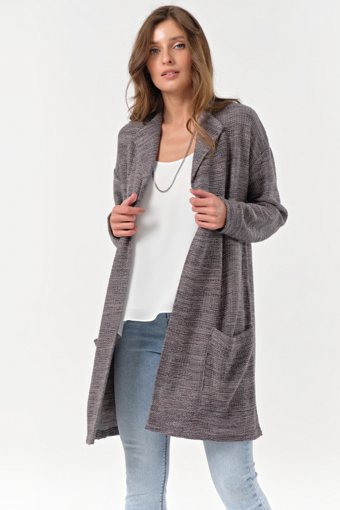 Особенности: Мягкий вязаный кардиган из фактурной меланжированной пряжи. Воротник отложной в форме лацкана. По переду выполнены накладные карманы.
