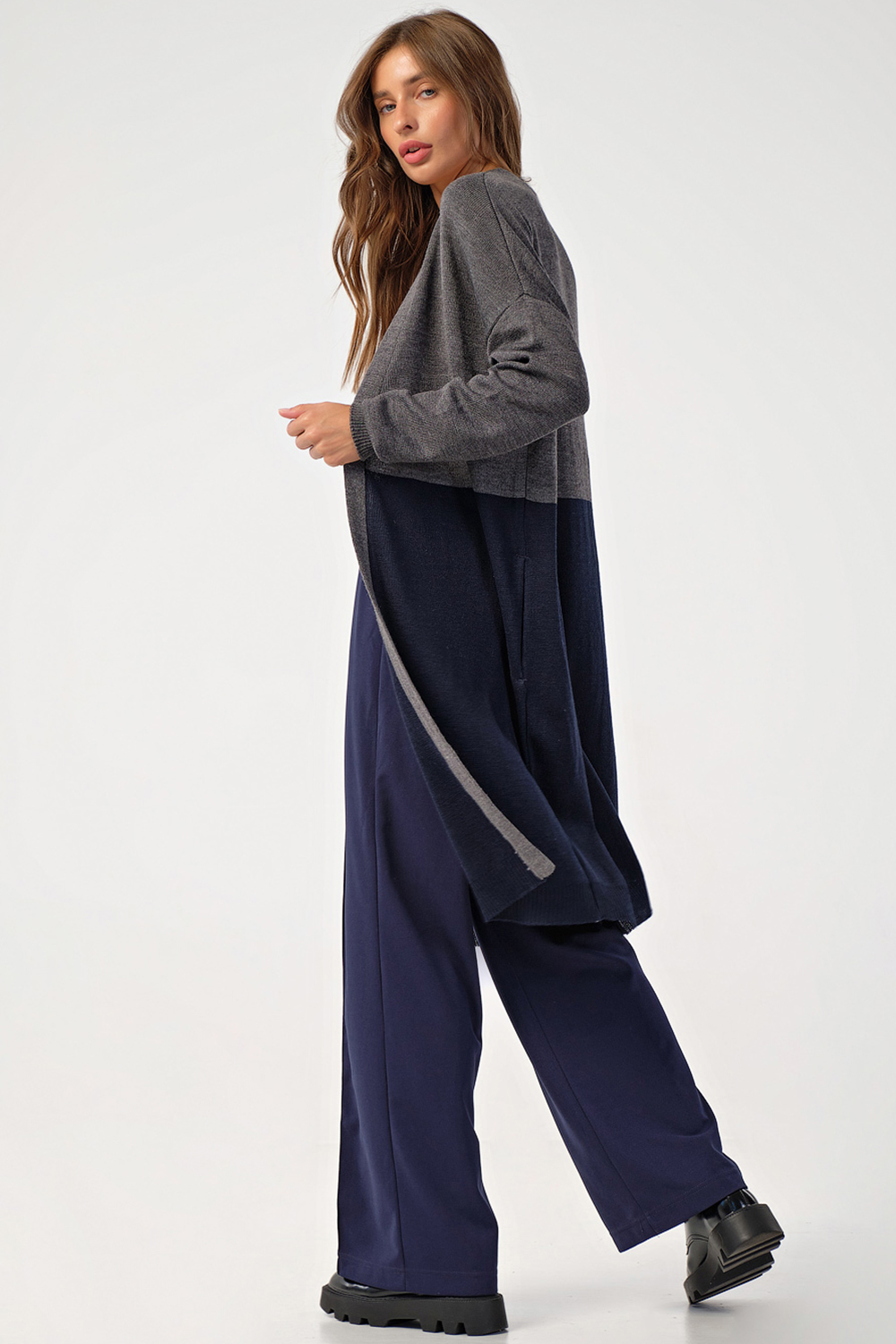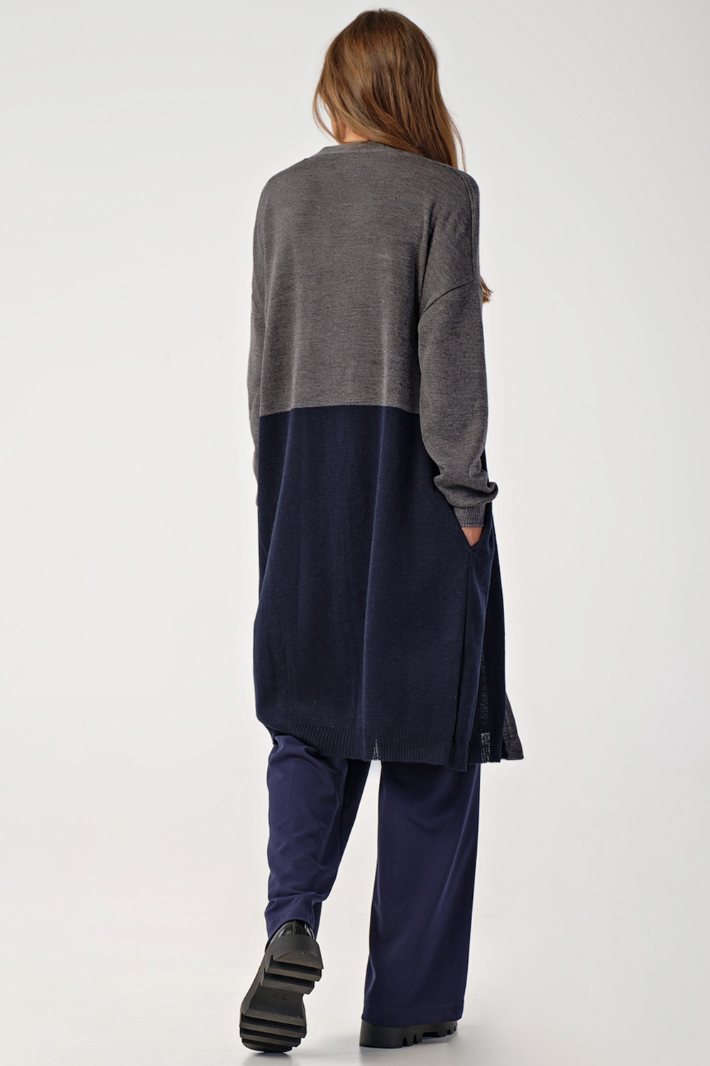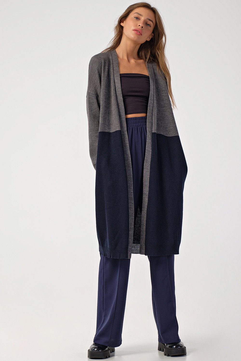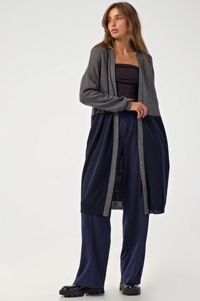 Вязаный двухцветный кардиган свободного силуэта без застежки в стиле "колор блок". Рукава длинные, со спущенной проймой. Полочки кардигана оформлены широкой бейкой. В боковых швах изделия выполнены карманы. Рукава и низ изделия оформлены резинкой в рубчик. Длина изделия 102 см