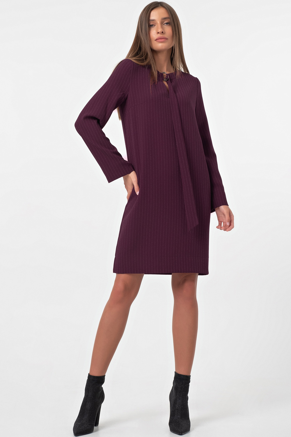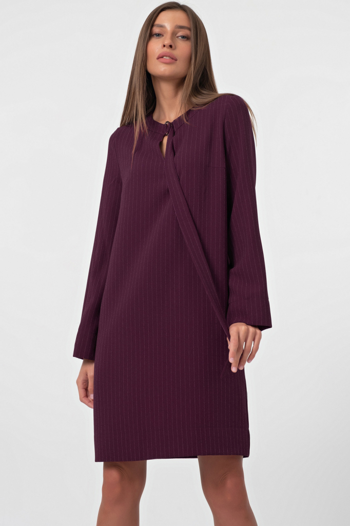 • Особенности: Платье прямого силуэта из креповой ткани в тонкую полоску. Детали: округлая форма горловины, по горловине отделка с двумя полукольцами и длинной завязкой, рукав втачной с широкой подгибкой слегка расклешенный, по низу изделия - широкая подгибка.