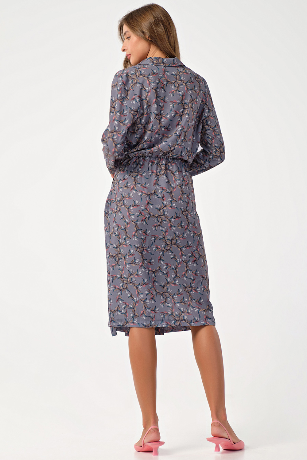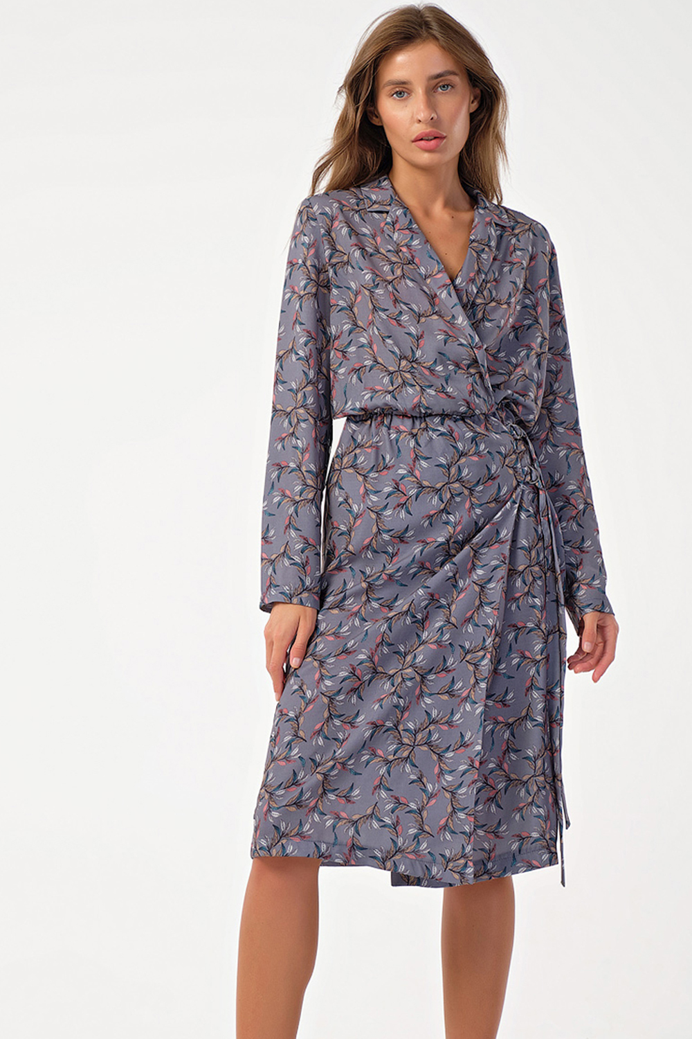 • Особенности: Платье из струящейся принтованной ткани. Детали: отложной воротник, запах, сборка на резинку по талии, два пояска с металлическими пряжками. Рукав втачной, длинный.