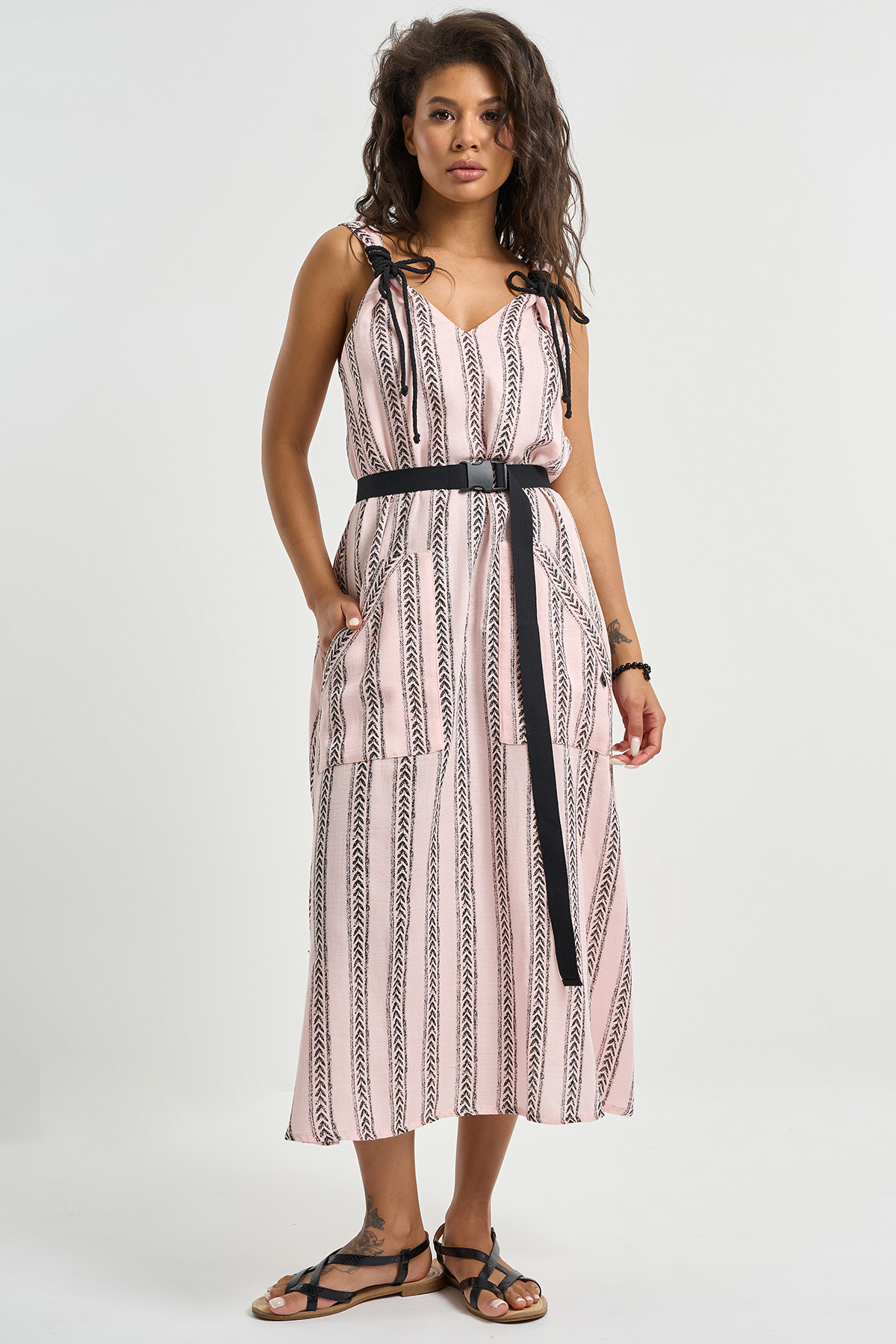 • Особенности: Платье расклешенного силуэта из хлопковой ткани. Детали: V-образный вырез горловины переда и спинки, широкие бретели с декоративным шнуром, пояс из киперной ленты с застежкой фастекс. Накладные карманы. Без застежки.