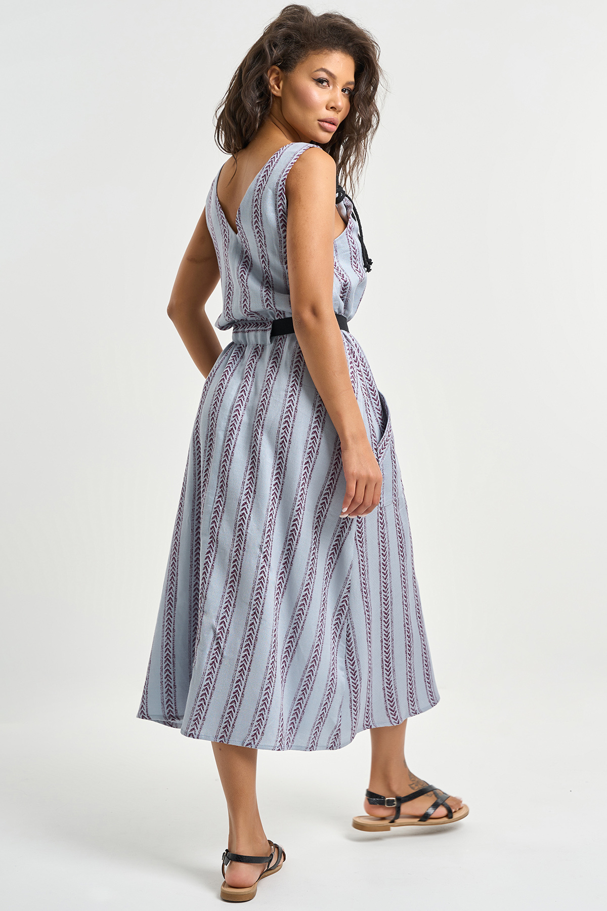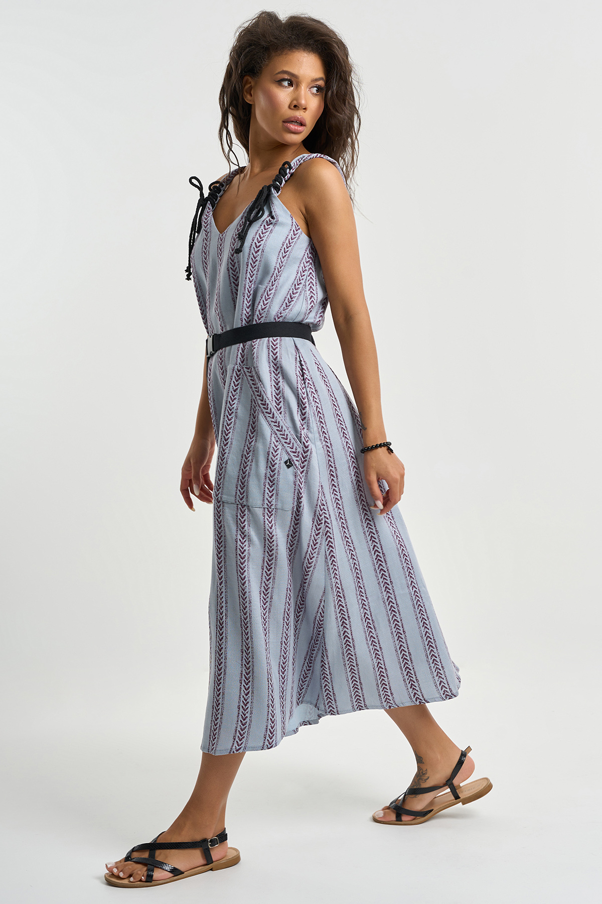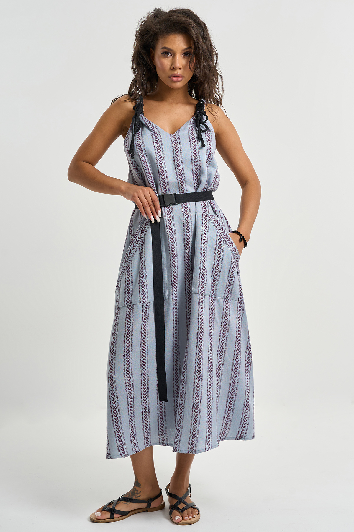 • Особенности: Платье расклешенного силуэта из хлопковой ткани. Детали: V-образный вырез горловины переда и спинки, широкие бретели с декоративным шнуром, пояс из киперной ленты с застежкой фастекс. Накладные карманы. Без застежки.