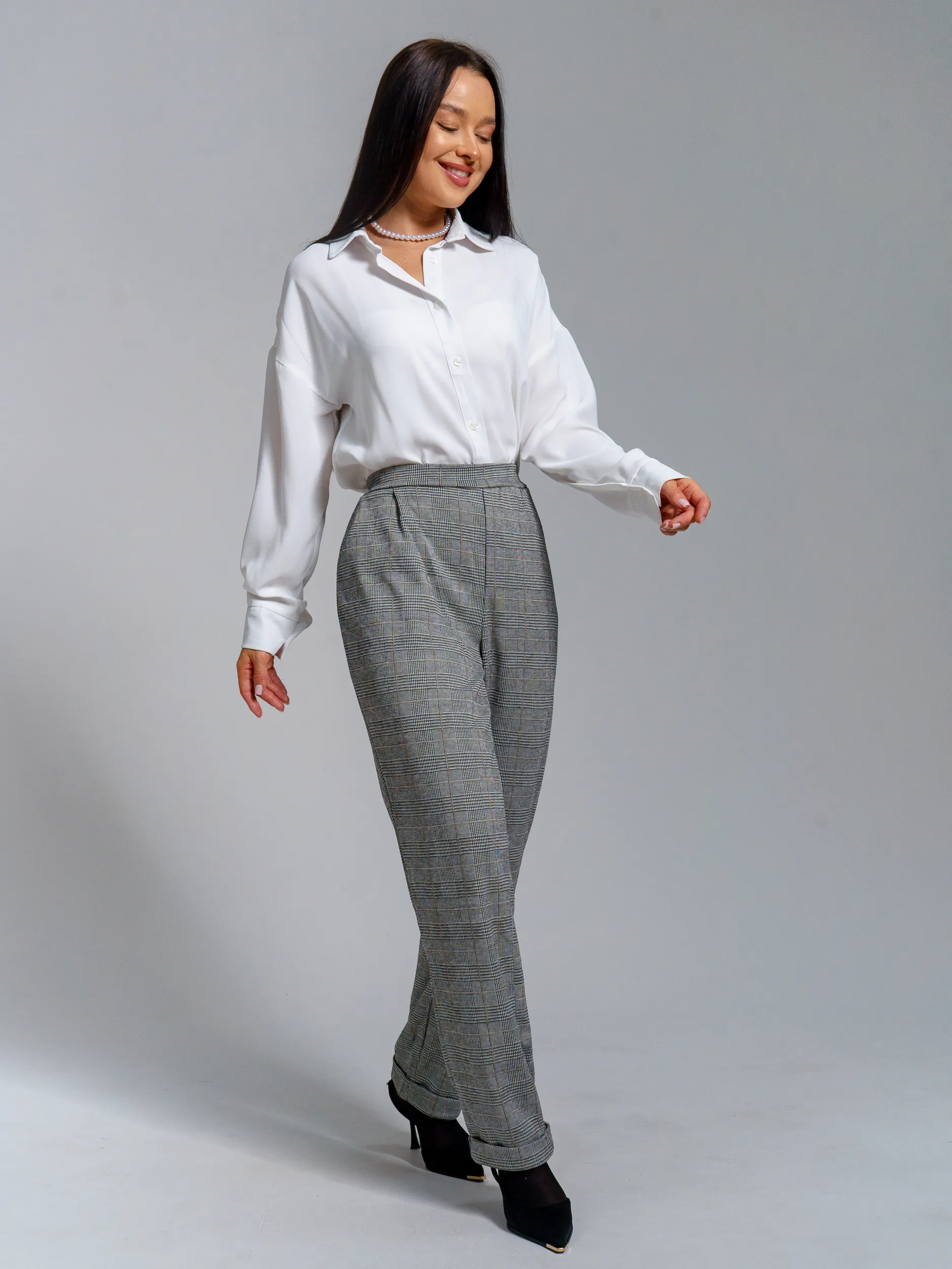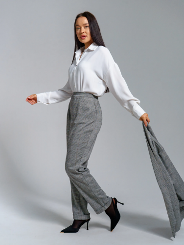 Брюки на поясе с боковыми карманами, задняя часть пояса собрана на резинку.